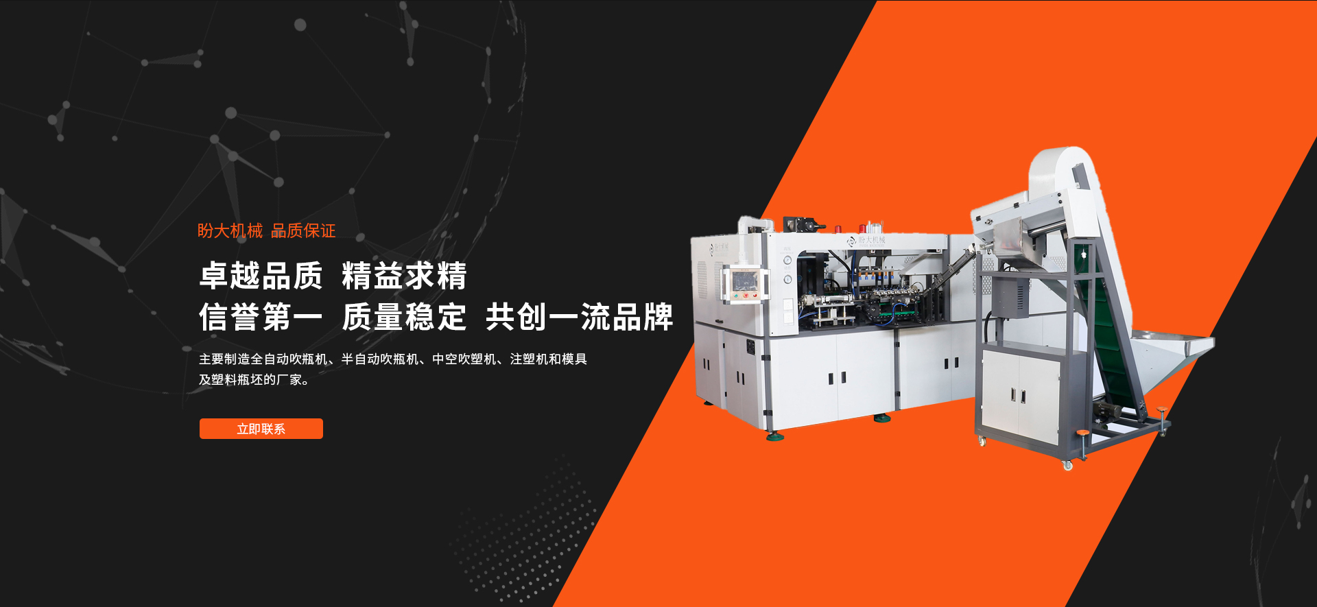 臺(tái)州盼大機(jī)械有限公司座落于東海之濱, 著名的“蜜桔之鄉(xiāng)”和“模具王國(guó)”—浙江黃巖。主要制造全自動(dòng)吹瓶機(jī)、半自動(dòng)吹瓶機(jī)、中空吹塑機(jī)、注塑機(jī)和模具及塑料瓶坯的廠家。本廠擁有多年的生產(chǎn)經(jīng)驗(yàn),采用進(jìn)口和國(guó)產(chǎn)的高質(zhì)量生產(chǎn)設(shè)備和檢驗(yàn)儀器。MT系列多功能吹瓶機(jī)是本廠生產(chǎn)和研發(fā)的一種操作簡(jiǎn)單、成品率高、適用性廣、可靠性穩(wěn)定的吹瓶機(jī)。采用進(jìn)口的先進(jìn)氣動(dòng)元件,設(shè)計(jì)以高效益,高精度,維修安全,集美觀耐用于一體。